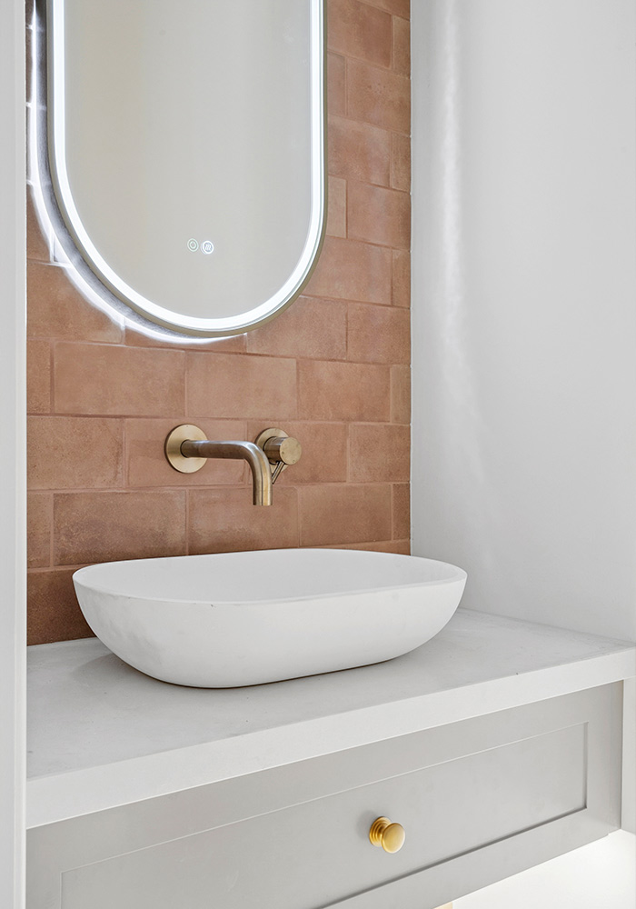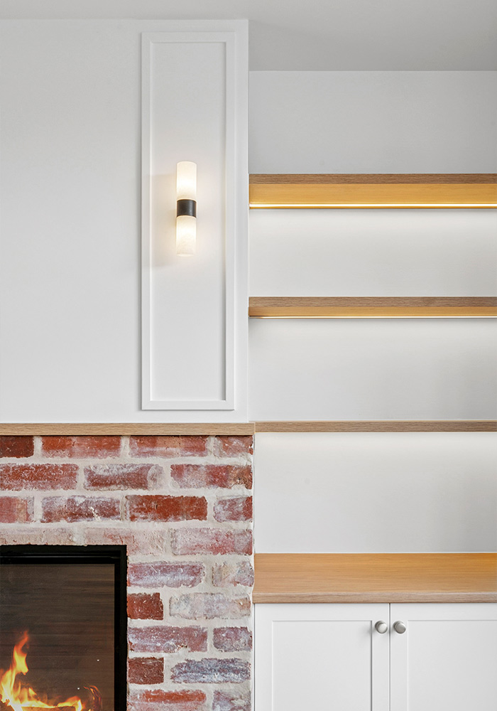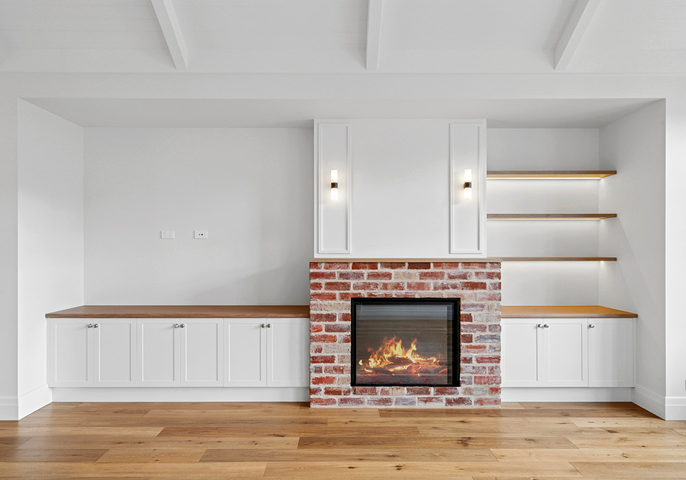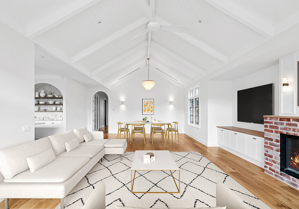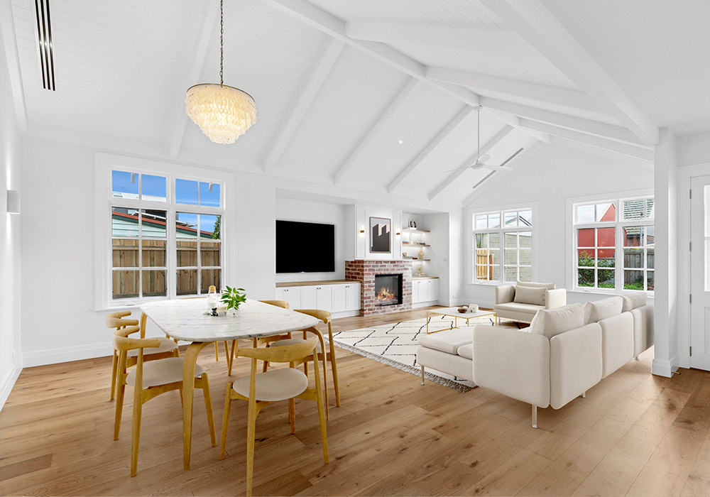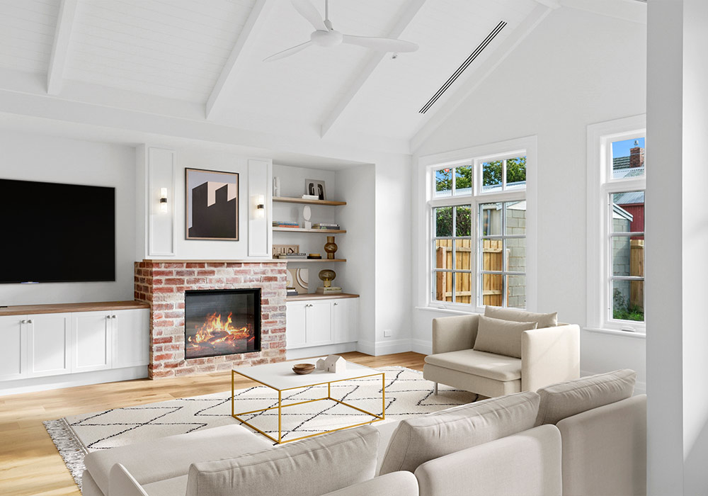 All windows were replaced with double glazed timber panelled casement windows, thoughtfully designed to remain in keeping with the home’s era. The original fireplace was reimagined with traditional red brickwork, seamlessly blending old and new.